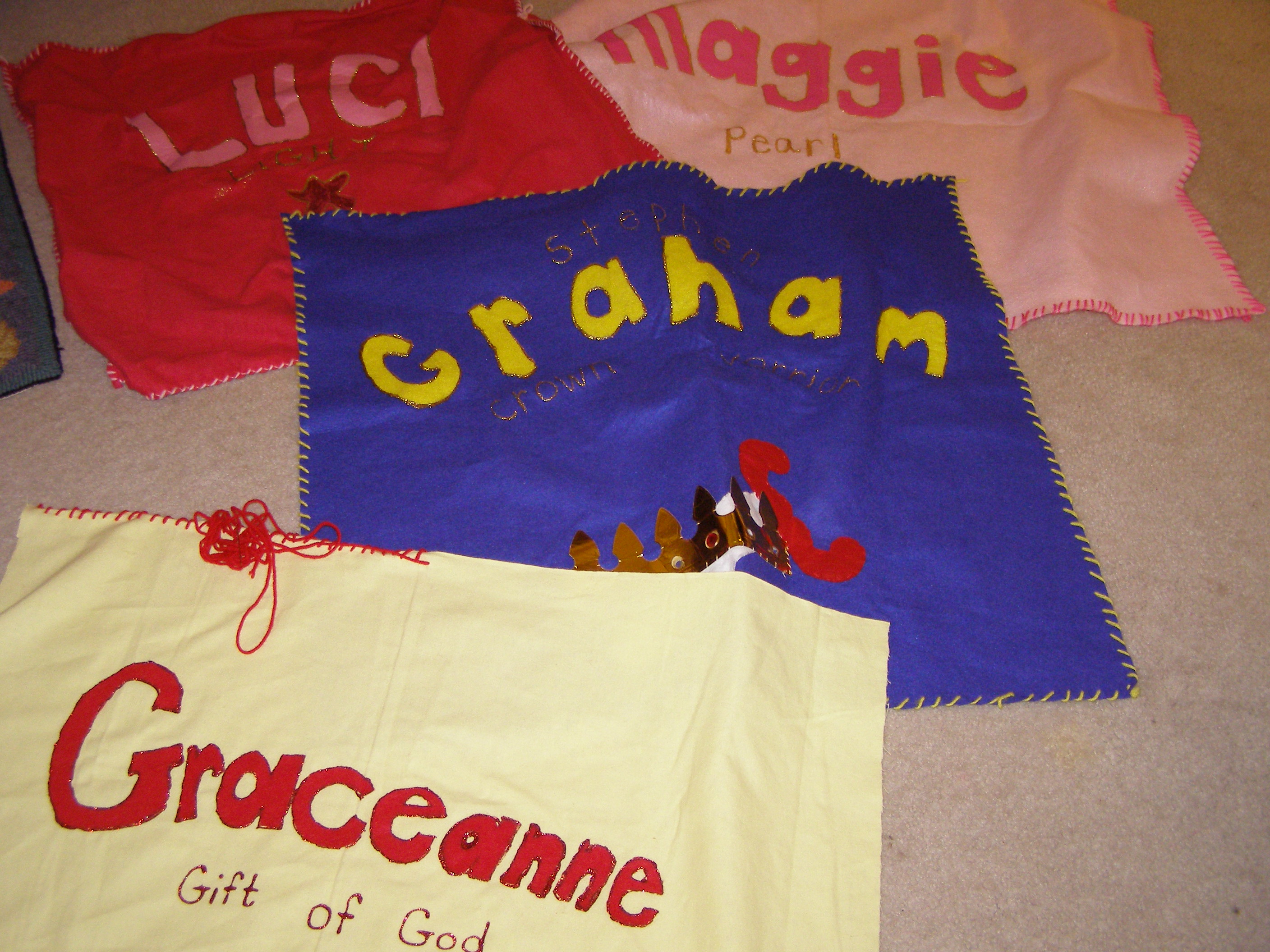 We fly that flag in honor of the child’s birthday and on other occasions deserving extra recognition. This is yet another habit we learned from the Doorposts family. This year I’ll be putting together our fifth flag. All of the children’s flags are made of simple felt, glue, yarn and a few sparkles.