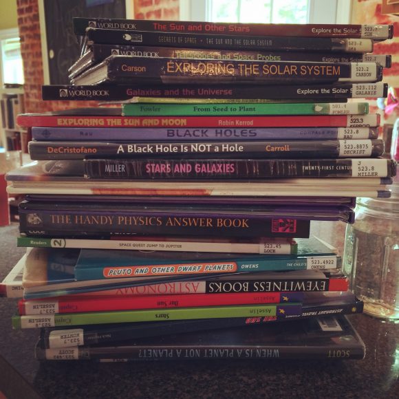 and the .When it takes four children to carry the stack 📚 Let the astronomy studies continue 🔭☄ #HodgepodgeSummer16 #HodgepodgeHomeschool