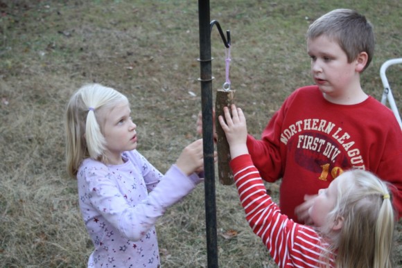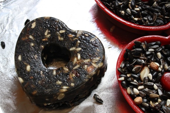 from the 2010 archives…We spent an entire afternoon Saturday making treats for the birds – and the bird lovers we know. Nana came across a really neat recipe for birdseed wreaths. I was especially excited about it because it is peanut free for our crew.