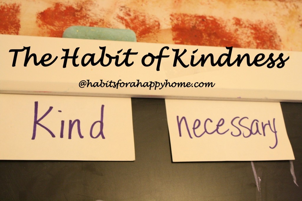 Several years ago, to help my children and me really get some handles on exhibiting kindness, I wrote these two words on index cards: kind and necessary and posted them around the house. Our goal was to only respond to each other in a kind way and not say anything unnecessary. This meant no ugly responses to each other or unkind words. Let me say when you stop and apply just these two little words to your home and life it will really make a difference. You will begin to realize just how much of the opposite goes on around the house, at least that’s the lesson we learned.
