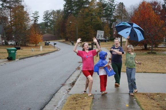 How did I miss this entry? I was going through my OHC carnival list and there it was ! This entry made me giggle with delight. I love that you took the opportunity to get out in the rain with your kids. They look like they really enjoyed themselves. I love the bare feet and shorts in the November rain….