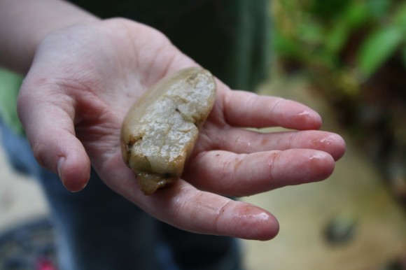 “I found a rock. My rock was shiny, smooth and dirty. There was a tornado warning north of us – when we got home from our walk.” – nine-year-old
